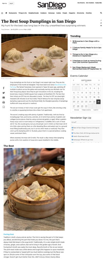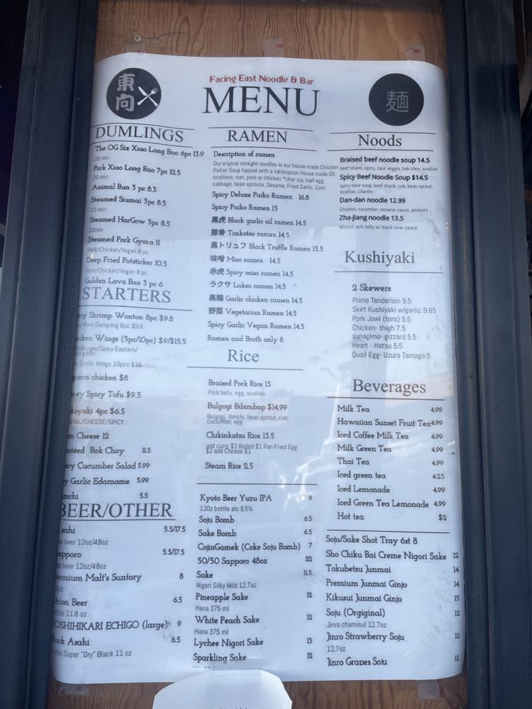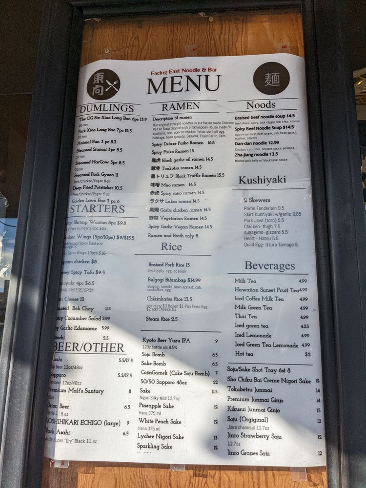 Facing East, a renowned ramen and noodle spot in San Diego, offers a vibrant blend of Asian Fusion dishes. This trendy restaurant boasts a variety of options, including soy-free, vegan, and many vegetarian choices. With a chic ambiance and attentive service, Facing East is perfect for lunch, dinner, or dessert outings. Standout dishes like the soup dumplings and spicy miso ramen have garnered high praise from patrons. The flavorful broth and perfectly soft-boiled eggs in the ramen promise a delightful culinary experience. Customers also rave about the kimchi and shrimp wontons, highlighting the restaurant's diverse menu. Despite some minor critiques on certain dishes' tenderness, Facing East overall impresses with its bold flavors and quick service. Don't miss out on the unique offerings at this gem on Convoy Street.