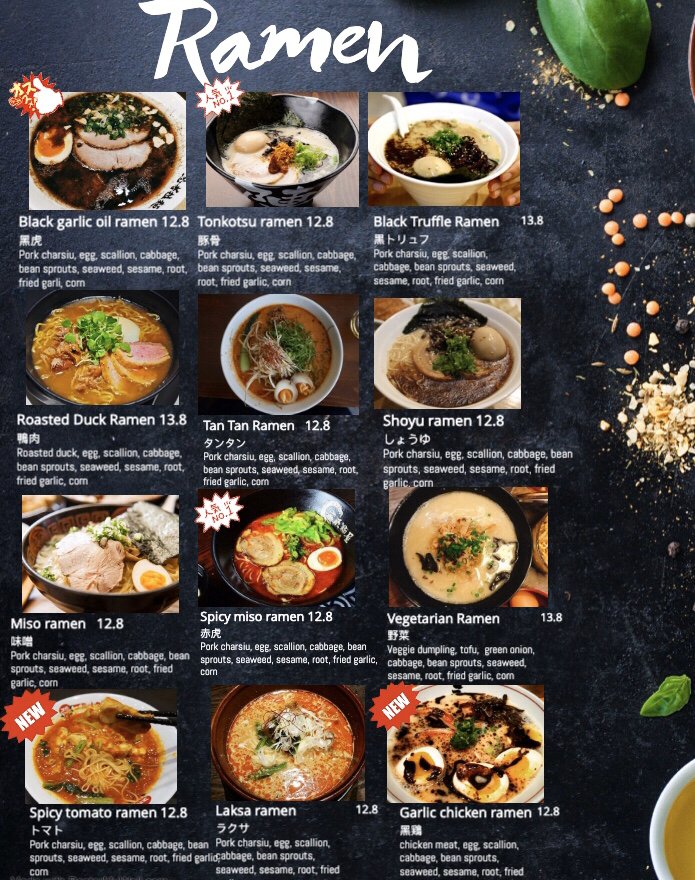Pork, egg, scallion, cabbage, bean sprout, seaweed, sesame, bamboo, fried garlic corn, black garlic oil.