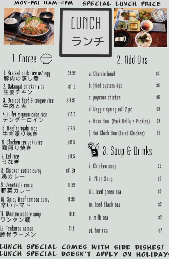 Breaded chicken cutlet served with over a bed of steamed rice and coleslaw on the side, drizzled with katsu sauce and spicy mayonnaise.
